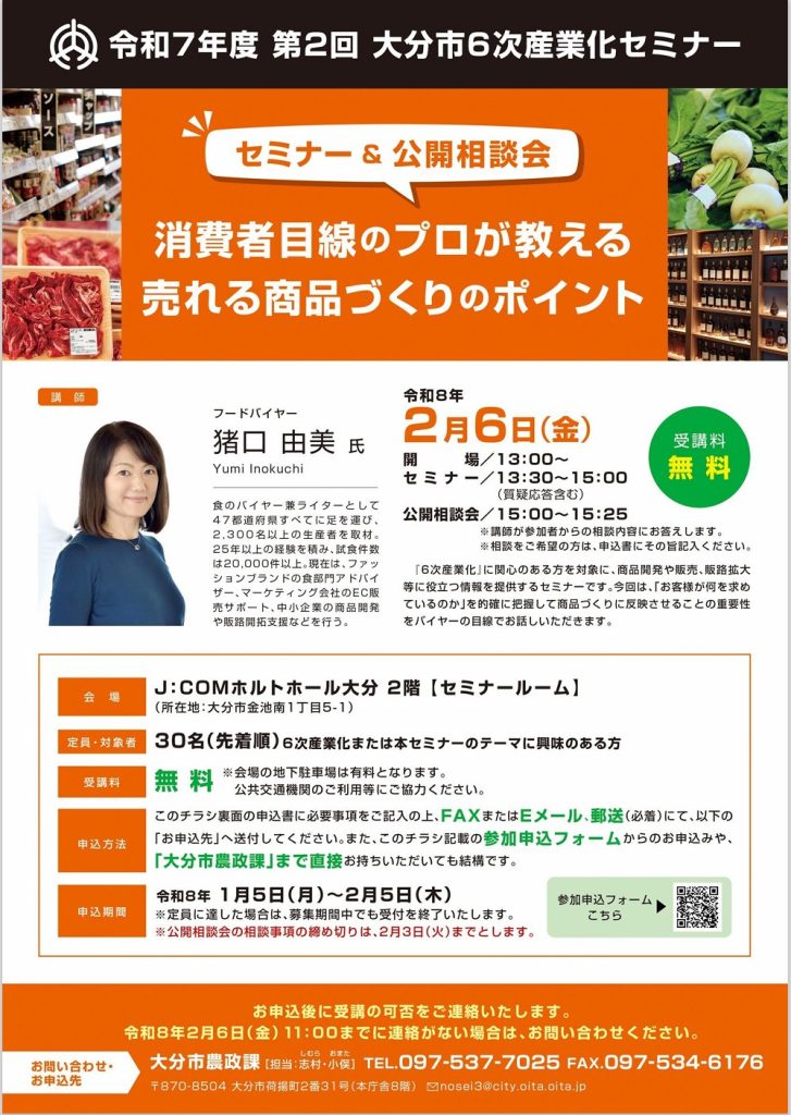 【大分市農政課】大分市6次産業化セミナー「消費者目線のプロが教える 売れる商品づくりのポイント」開催のお知らせ